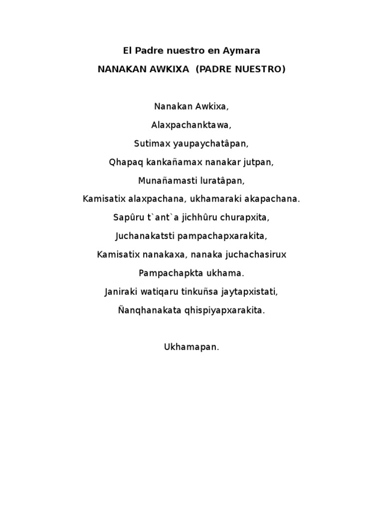 Unan en su interior la esencia de cada pueblo de cada raza de cada credo y religin. El Padre Nuestro en Quechua Our Father in Quechua 29 May En la historia existieron numerosas traducciones del Padre Nuestro el rezo que ense. Hgase tu voluntad en la tierra como en el cielo.