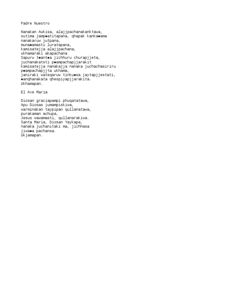 Hgase tu voluntad en la tierra como en el cielo. Danos hoy nuestro pan de cada da. Tumpamantawan tukuy Jallpʼamanta runaqa hermanos kasunchik juk runajinallataq chiqa Diosninchikta yupaychasunchik.